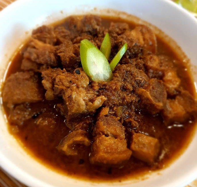 고기를 간장과 식초로 조린 요리로 밥과 함께 먹는다.