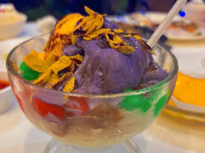 얼음 위에 과일, 젤리, 팥, 우베(자색고구마) 등의 토핑을 올린 달콤한 디저트이다.