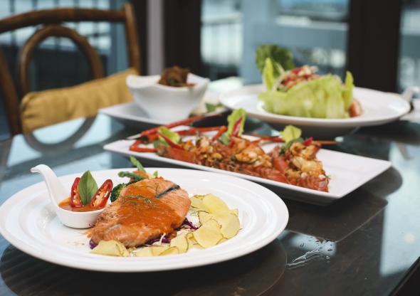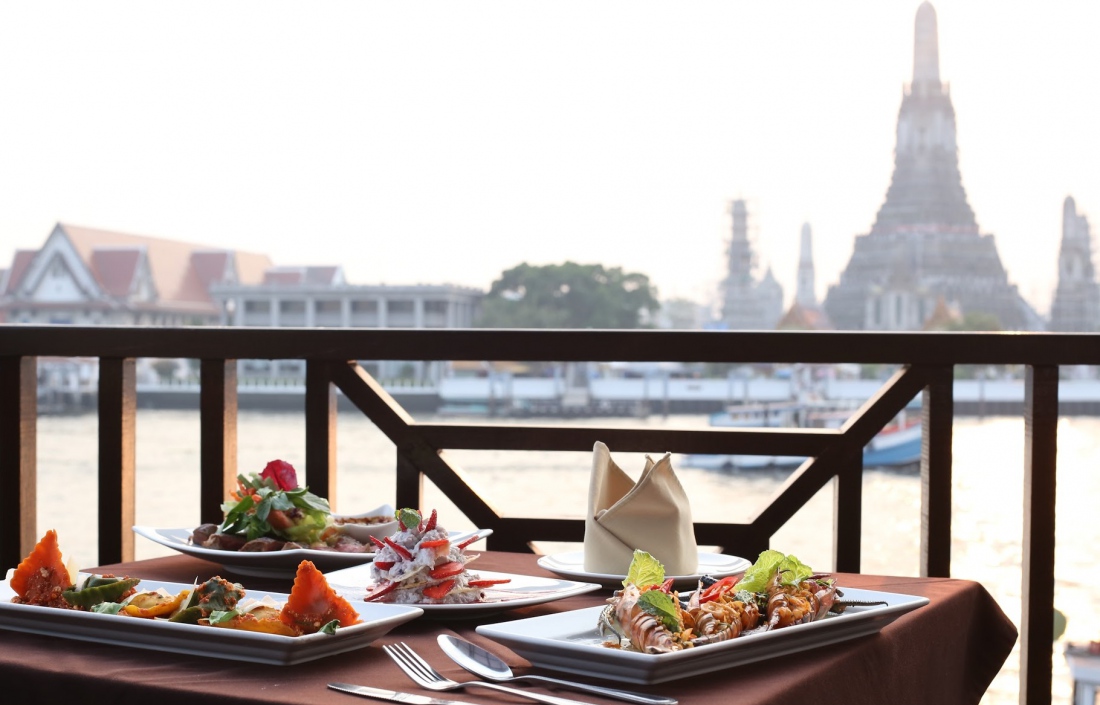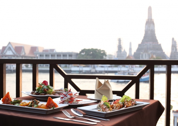 강 건너 왓 아룬을 보며 즐기는 아시아 퓨전요리 레스토랑