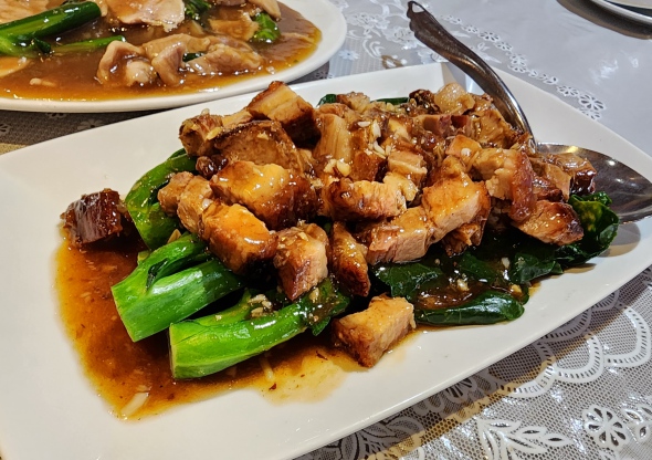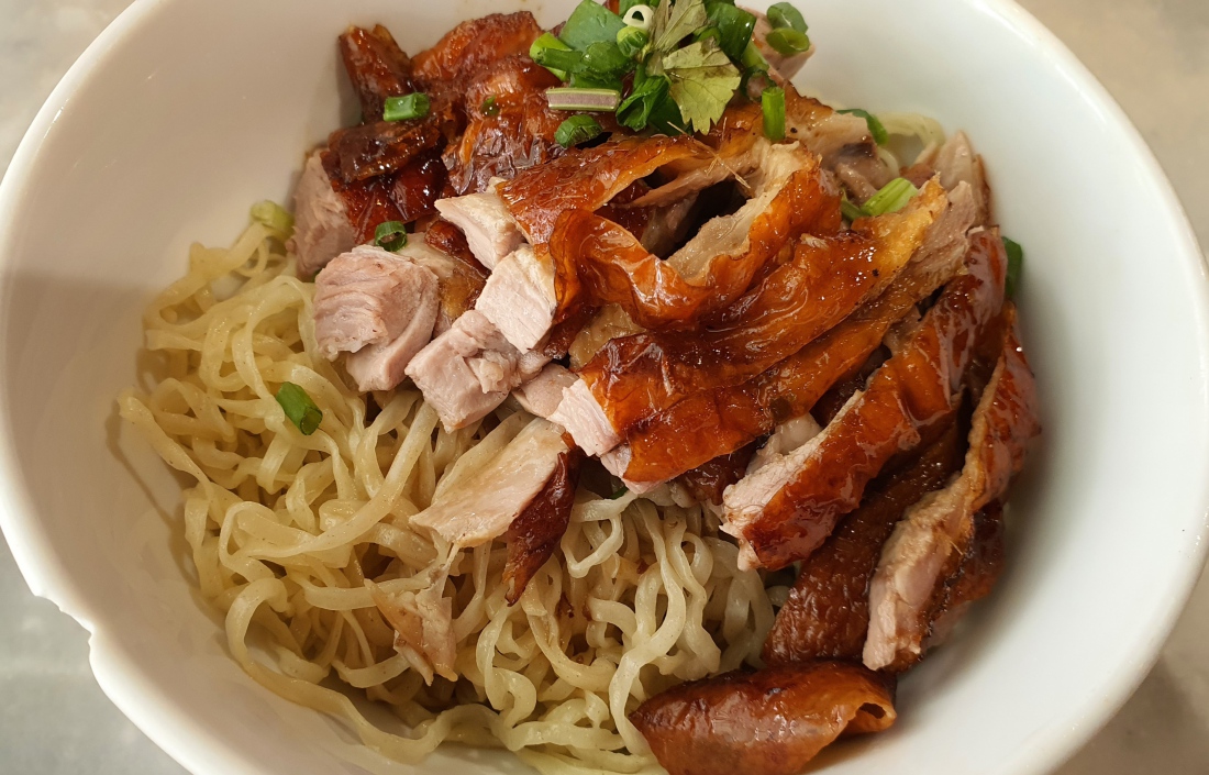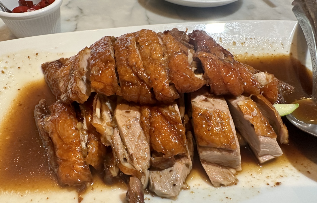 roasted duck, crispy roasted pork belly