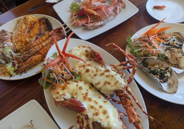 신선한 해산물을 합리적인 가격에 다양하게 즐길 수 있는 곳으로, 모닝글로리, 부채새우, 치즈 가리비구이를 특히 추천함. 음식은 한국인의 입맛에 잘 맞고, 전반적으로 간간한 편이라 식으면 짜게 느껴질 수 있다. 석양이 보이는 창가에서 식사할 수 있는 뷰가 좋지만, 에어컨이 없어 더울 수 있어 선풍기 자리 추천. 직원들은 친절하며 서비스가 좋고, 음식은 대부분 빨리 나오지만 랍스터 요리는 시간이 걸린다. 일부 요리들은 평범할수있으나, 생후추를 활용한 요리는 독특하고 맛있다. 관광지 근처라 편리하며, 엄마나 부모님과 방문하기에도 적합한 곳으로 현지 로컬 스타일에 비해 깔끔하고 쾌적하며, 음식과 뷰 모두 만족스러움